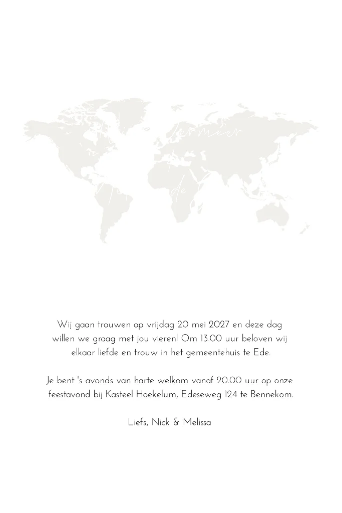 Een wedding paspoort als uitnodiging voor jullie bruiloft? Op deze witte trouwkaart staan een wereldkaart en vliegtuig, perfect als jullie van reizen houden! De uitnodiging is afgewerkt met goudfolie. Pas de kleuren en lettertypes nog helemaal naar wens aan.