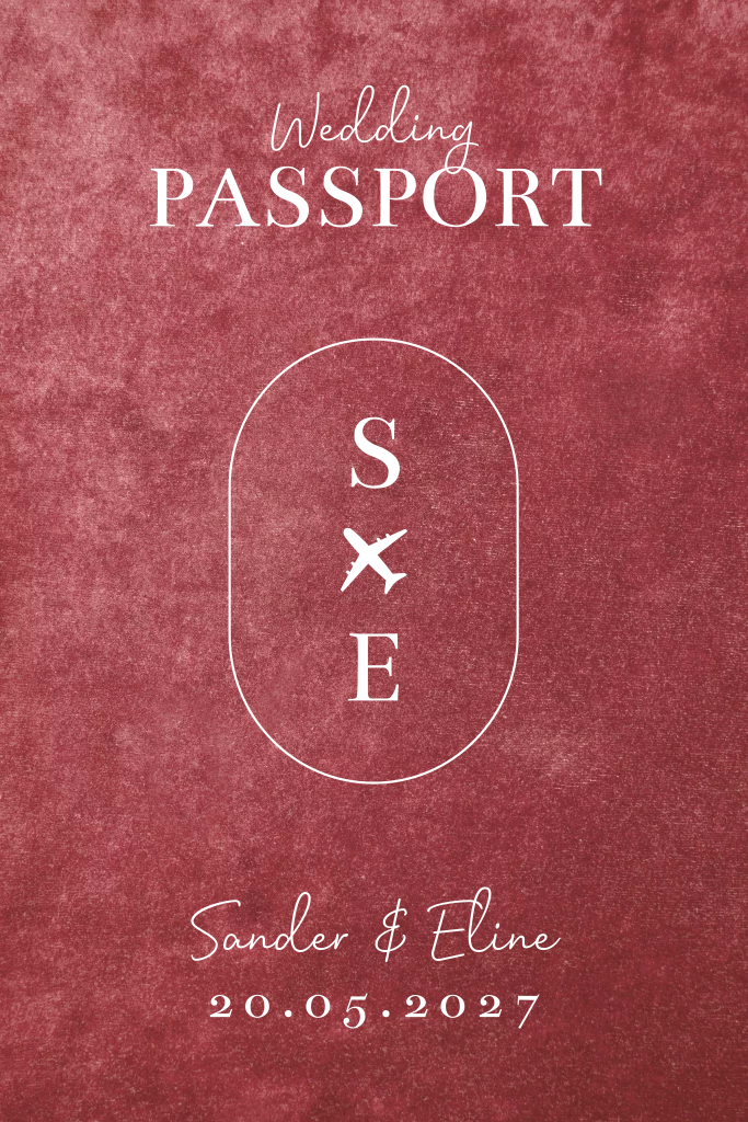 Een wedding paspoort als uitnodiging voor jullie bruiloft? Op deze rode trouwkaart met velvet look staat een trouwlogo met vliegtuig, perfect als jullie van reizen houden! De uitnodiging is afgewerkt met goudfolie. Pas de kleuren en lettertypes nog helemaal naar wens aan.