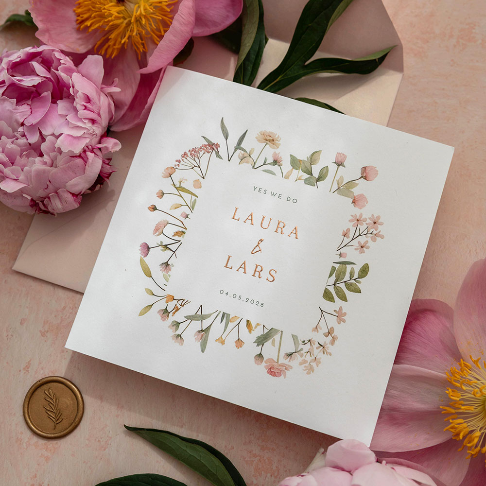 Trouwkaart met een rand van pastel gekleurde watercolor bloemen: perfect voor een romantische bruiloft! De uitnodiging is afgewerkt met glimmende rosefolie en aan de binnenzijde is plaats voor een mooie songtekst of gedichtje.| Totaalprijs: 0 |