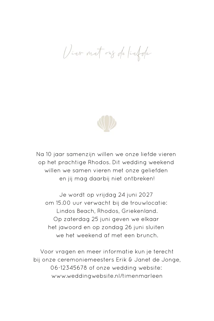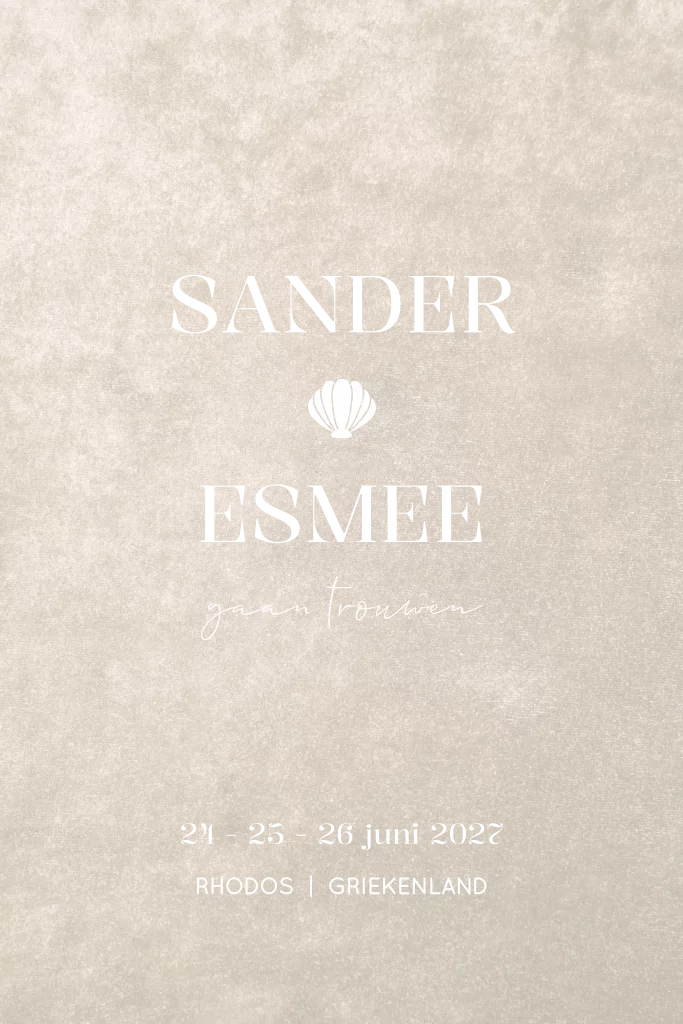 Trouwen jullie op het strand? Of in het buitenland? Dan past deze trouwkaart met strand thema en schelp er prachtig bij! De uitnodiging is afgewerkt met goudfolie. Pas de trouwkaart nog naar wens aan in de editor.
