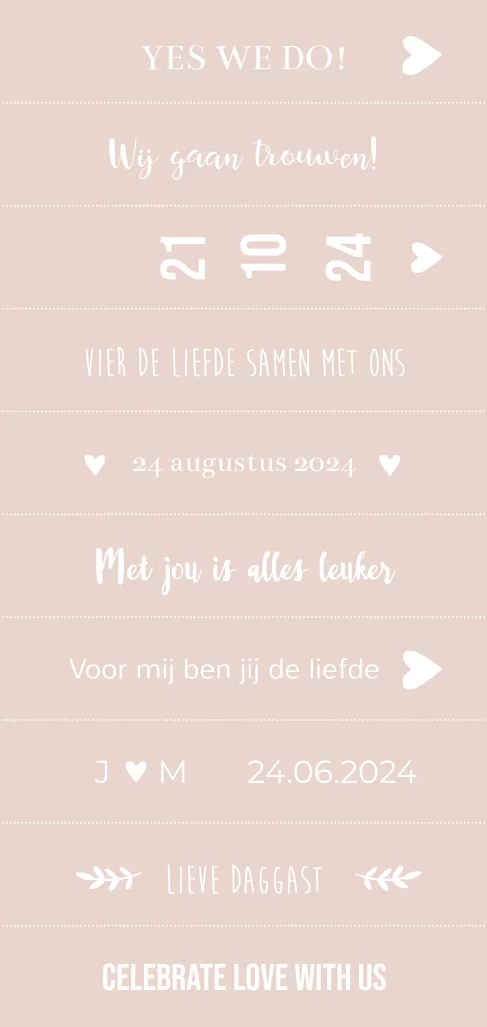 DIY labels met roze achtergrond. Pas de kleuren, lettertypes en achtergrond helemaal naar wens aan, zodat deze mooi bij de trouwkaart past. Deze labels moet je nog wel zelf snijden/knippen. Je kunt ze met een bijpassend lintje, touwtje of paperclip aan de kaart bevestigen. De labeltjes hebben een formaat van 10x2,1 cm. De snijlijnen aan de voorzijde staan op niet printen, dit betekent dat ze straks in het uiteindelijke ontwerp alleen op de achterzijde te zien zijn. Zo zijn ze op de voorzijde niet meer zichtbaar als ze zijn uitgesneden en zien de labels er netjes uit.