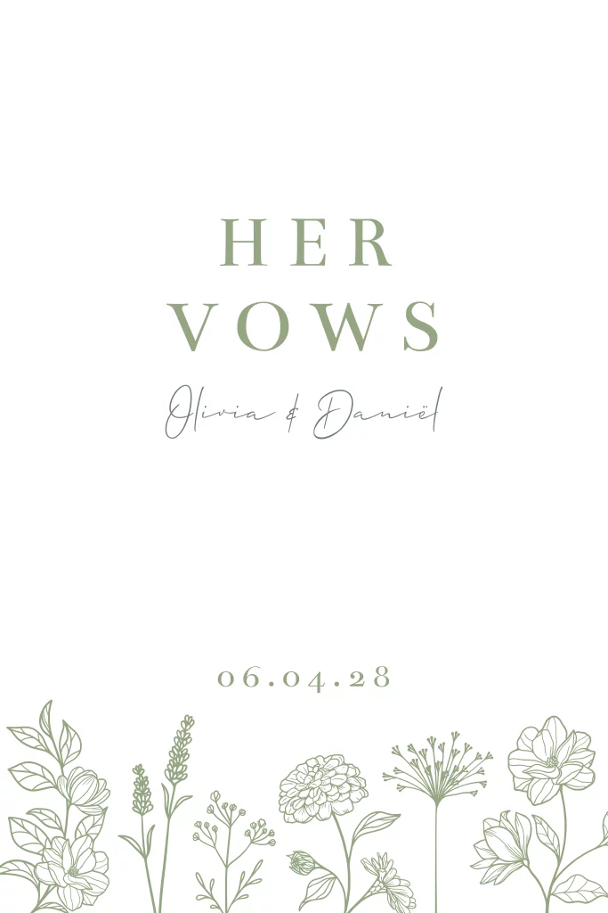 Een geloftenboekje met getekende groene bloemen. Er is een complete trouwhuisstijl beschikbaar. Zo is al het drukwerk voor jullie bruiloft in dezelfde stijl! In dit boekje kun je jullie geloften voor tijdens de ceremonie zetten. Versie: Her Vows