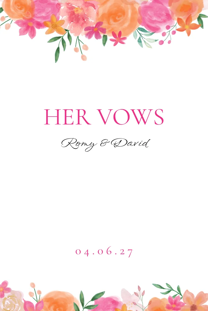 Een mooi geloftenboekje met rand van kleurrijke bloemen in roze en oranje tinten. Vul de geloften in voor de ceremonie op jullie bruiloft. Zo past de geloftenkaart helemaal bij jullie trouwkaart! Versie: Her Vows