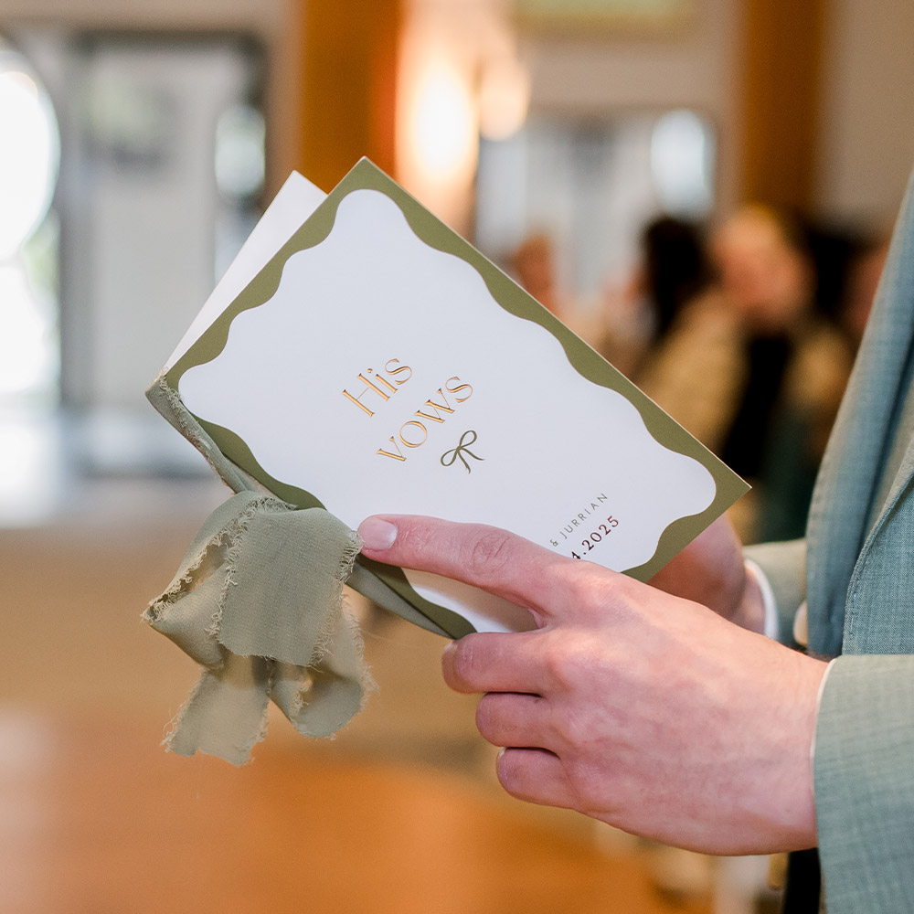 Een geloftenboekje met een golvende vorm en strikje, passend bij de trouwhuisstijl Chic Bow. Zo is al het drukwerk voor jullie bruiloft in dezelfde stijl! In dit boekje kun je jullie geloften voor tijdens de ceremonie zetten. Versie: His Vows. Fotografie: Laura de Borst