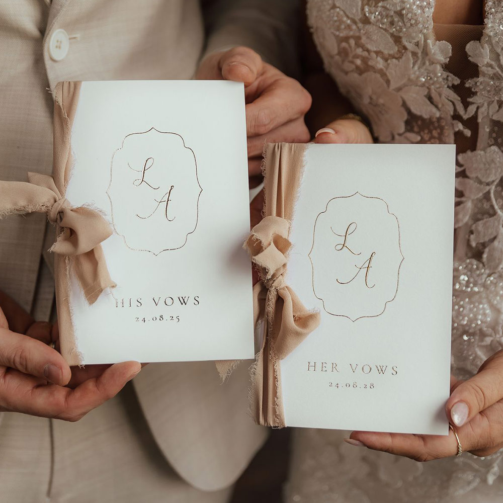 Een klassiek geloftenboekje met witte achtergrond kleur en glimmende goudfolie voor bij de ceremonie op jullie bruiloft! Vul aan de binnenzijde de geloften in voor tijdens de ceremonie op jullie bruiloft. Versie: His Vows