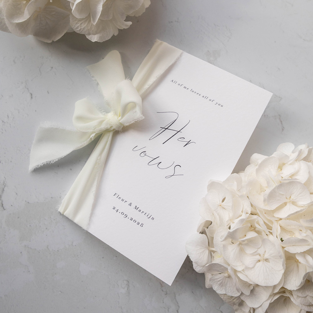 Chique geloftenboekje met sierlijke zwarte letters voor bij de ceremonie van jullie bruiloft. Vul jullie geloften helemaal in de stijl van jullie trouwkaart in, zodat alles mooi in één stijl is! Versie: Her Vows