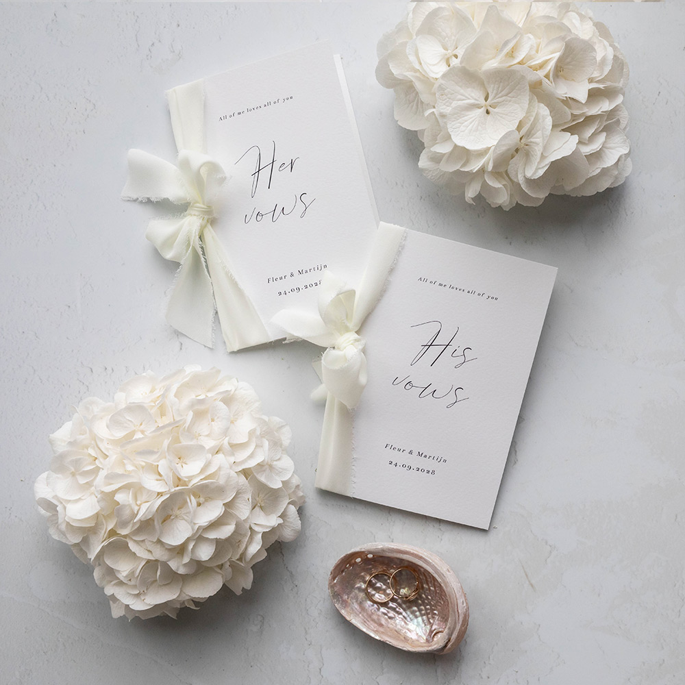 Chique geloftenboekje met sierlijke zwarte letters voor bij de ceremonie van jullie bruiloft. Vul jullie geloften helemaal in de stijl van jullie trouwkaart in, zodat alles mooi in één stijl is! Versie: His Vows