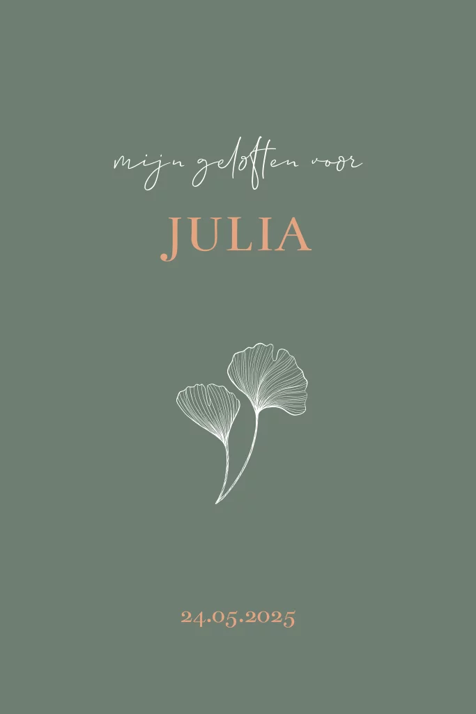 Modern geloftenboekje in een groene kleur met ginkgo blaadjes. Schrijf hierin jullie geloften voor op jullie bruiloft. Pas de kleuren aan naar die van jullie trouwkaart, zodat alles bij elkaar past! Versie: His Vows