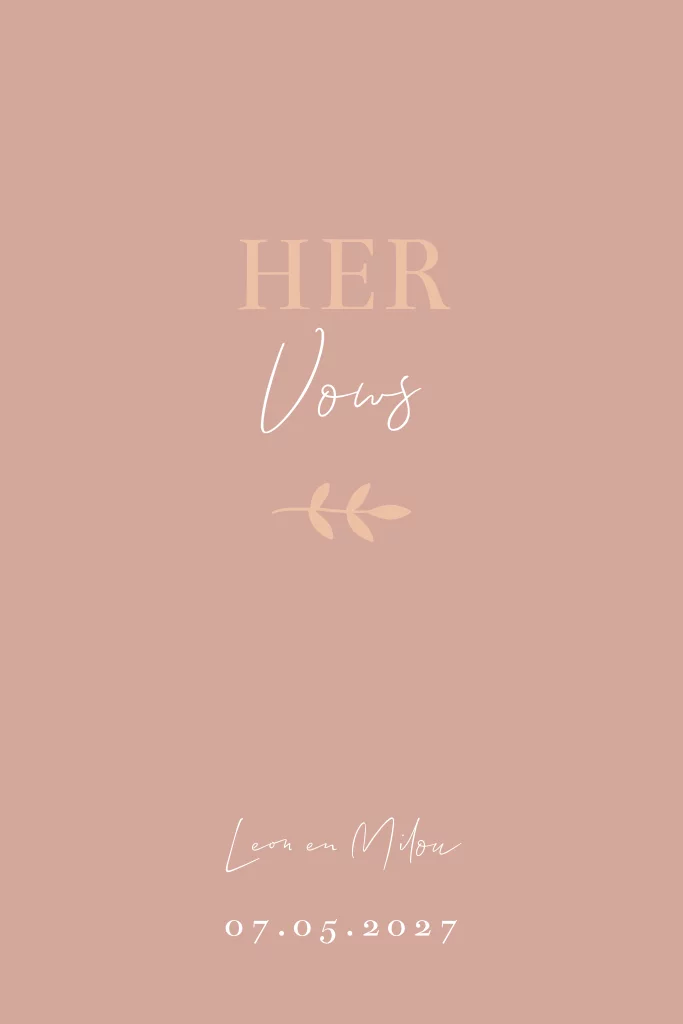 Geloftenkaart in de stijl van jullie trouwkaart! Schrijf hierin de geloften voor tijdens de ceremonie. Dit geloftenboekje heeft een roze kleur en een sierlijk takje. Versie: HER Vows