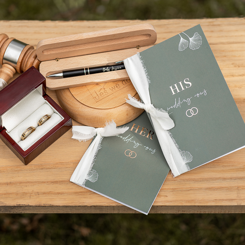 Geloftenboekje met groene achtergrond, rosefolie en ginkgo blaadjes. Super mooi als de geloftenkaart voor tijdens de ceremonie op jullie bruiloft mooi bij het trouwdrukwerk past! Versie: His Vows| Totaalprijs: 0 |