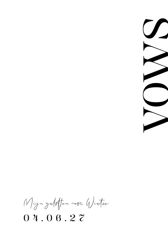 Modern geloftenboekje in de stijl van jullie trouwkaart! Zo past al het drukwerk perfect bij elkaar! In dit boekje kun je jullie geloften voor tijdens de ceremonie zetten. Versie: Her Vows| Totaalprijs: 0 |