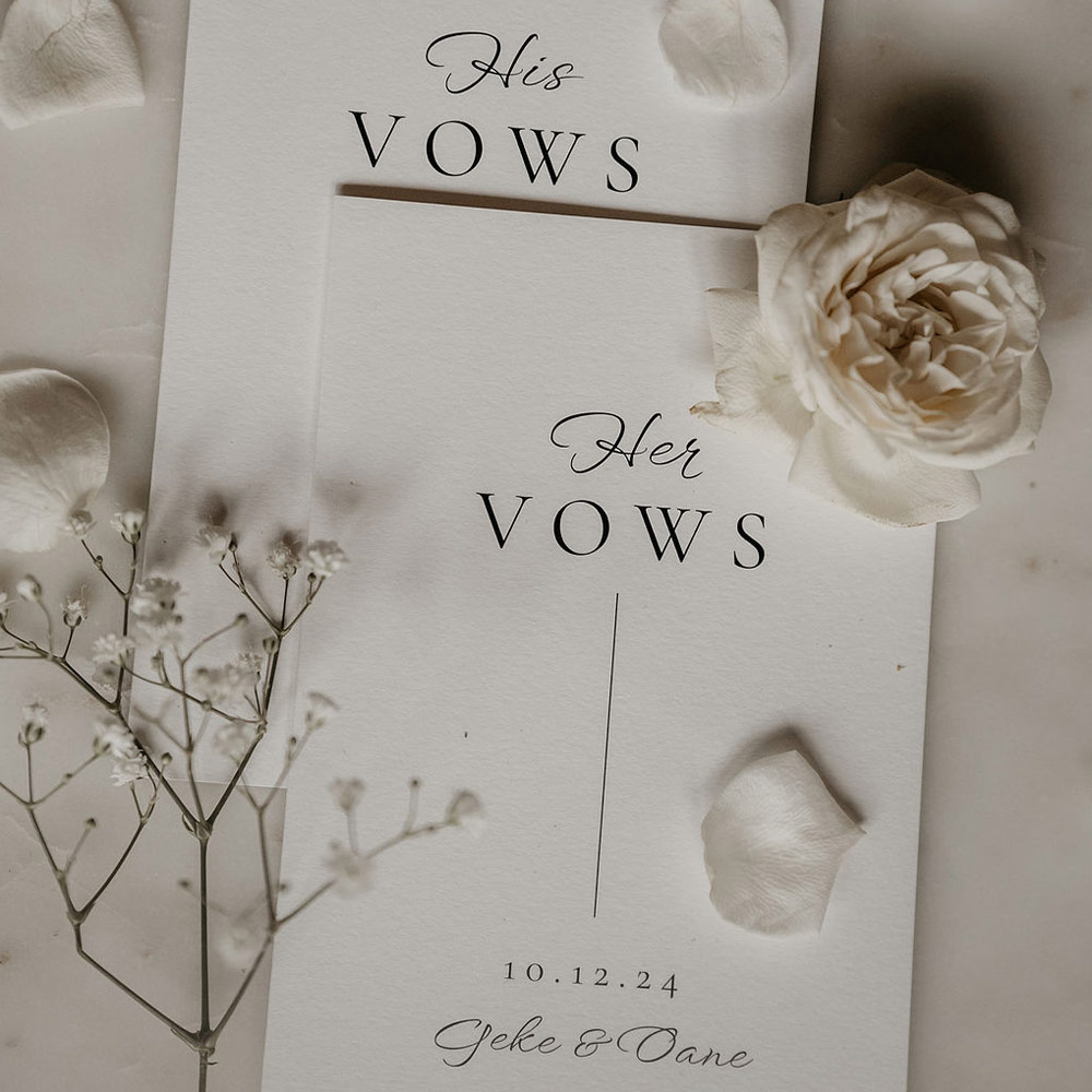 Klassiek geloftenboekje in de stijl van jullie trouwkaart! Zo past al het drukwerk perfect bij elkaar! In dit boekje kun je jullie geloften voor tijdens de ceremonie zetten. Versie: Her Vows