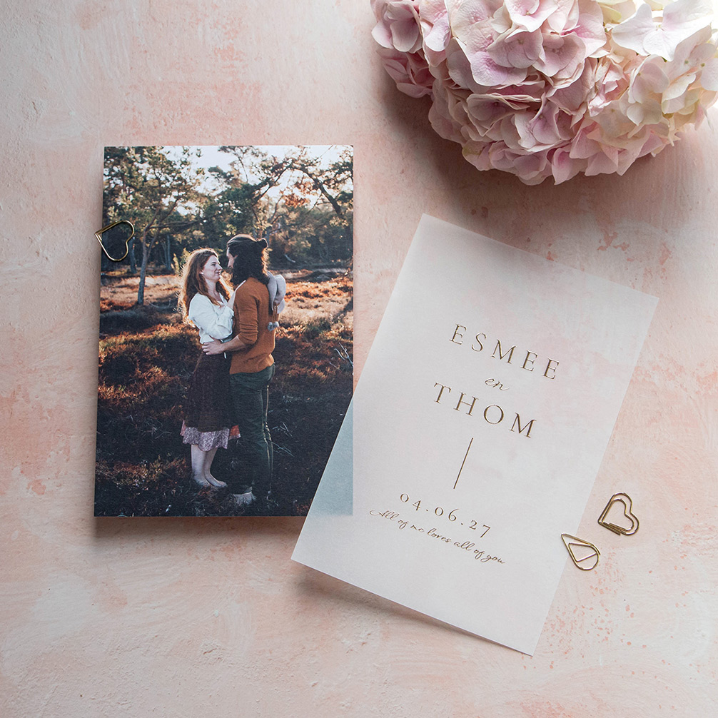 Deze achterkaart met foto is het 2e deel van een trouwkaart met kalkpapier voorkant. Vervang de voorbeeldfoto door een mooie foto van jullie samen. Vergeet niet dat er nog een transparant vel bij deze achterkaart hoort. Je bevestigt de achterkaart aan de voorkaart met een paperclip, touw of lintje.