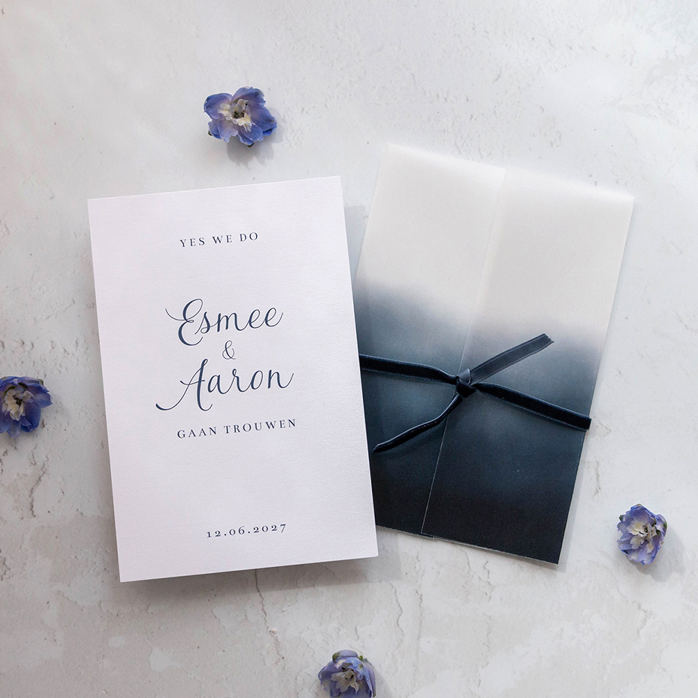 Klassieke witte trouwkaart met sierlijke donkerblauwe letters. Bij deze kaart past een kalkpapier omslag die je om de kaart kunt vouwen. Pas de kleuren en lettertypes nog naar wens aan. Bestel deze kaart in het formaat 17,1 x 11,4 cm, zodat de kaart mooi in de kalkpapier omslag past.
