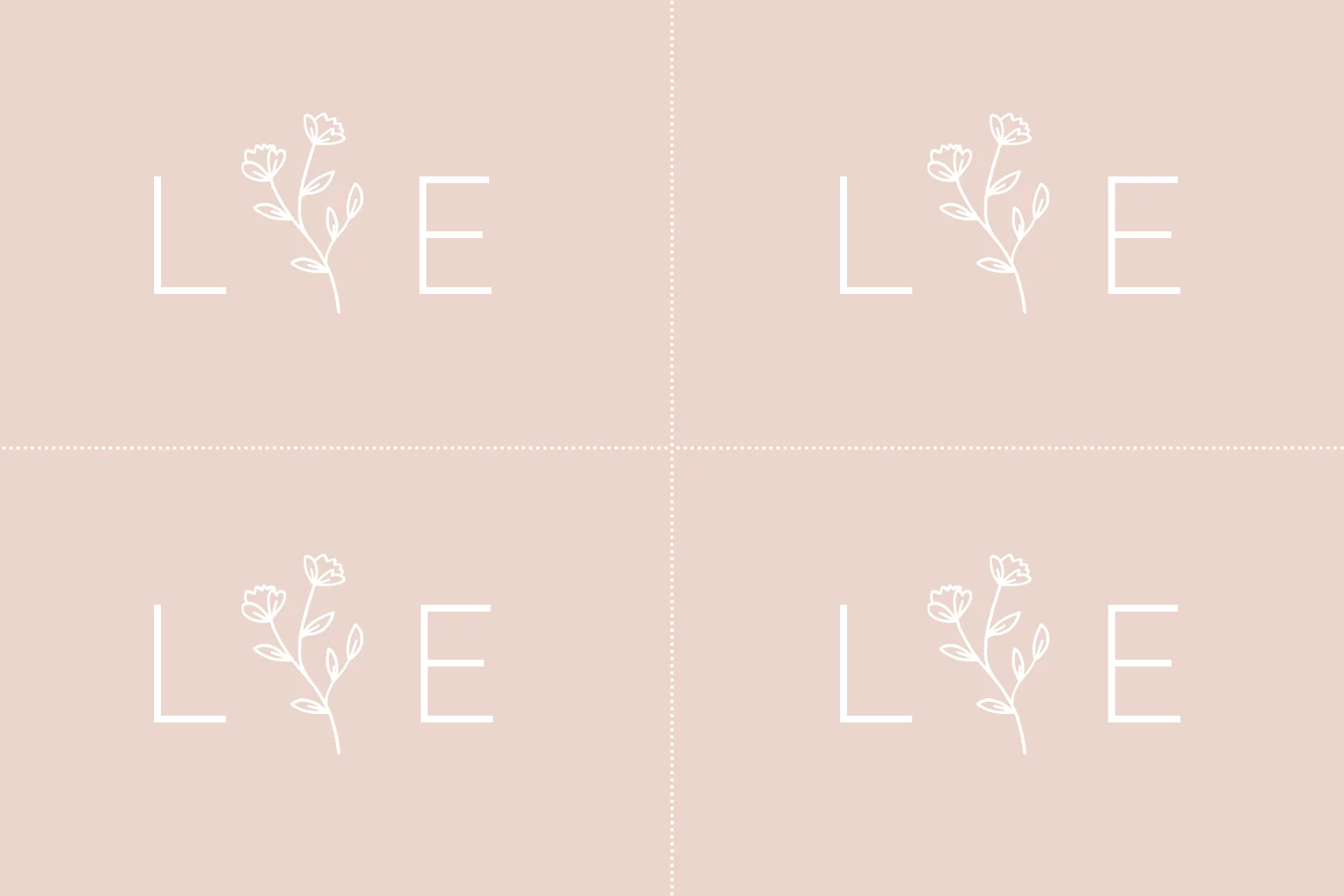 DIY labels voor bij de trouwkaart met rosefolie en bloemen. Deze labels moet je nog wel zelf snijden/knippen. Je kunt ze met een bijpassend lintje, touwtje of paperclip aan de kaart bevestigen. Druk deze kaartjes af op een kaart van 17x11 cm en dan heb je 4 labels van 8,5x5,5 cm. De snijlijnen aan de voorzijde staan op niet printen, dit betekent dat ze straks in het uiteindelijke ontwerp alleen op de achterzijde te zien zijn. Zo zijn ze op de voorzijde niet meer zichtbaar als ze zijn uitgesneden en zien de labels er netjes uit.