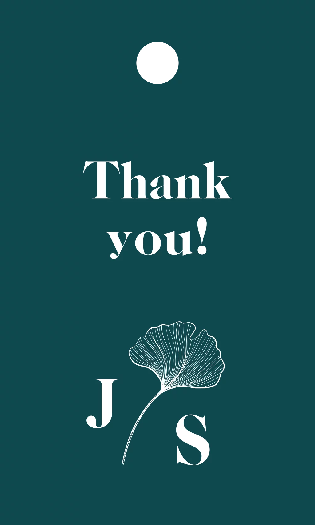 Donkergroene labeltjes voor aan de bedankjes op jullie bruiloft. Vul jullie eigen initialen in op het bedank label. Het label heeft een formaat van 30x50 mm en is voorzien van een klein boorgaatje. Pas het label helemaal aan in de kleuren en stijl van jullie kaart.