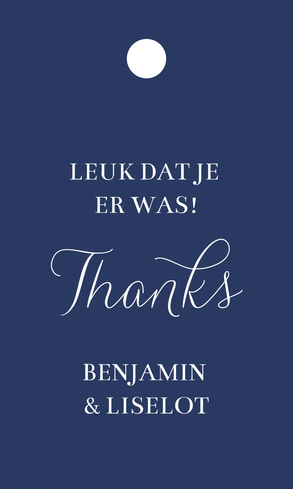 Donkerblauw label voor aan de bedankjes op jullie bruiloft. Het label heeft een formaat van 30x50 mm en is voorzien van een klein boorgaatje. Specificaties: - Formaat: 30x50 mm - 18 labels per vel - Papiersoort: coated karton| Totaalprijs: 0 |