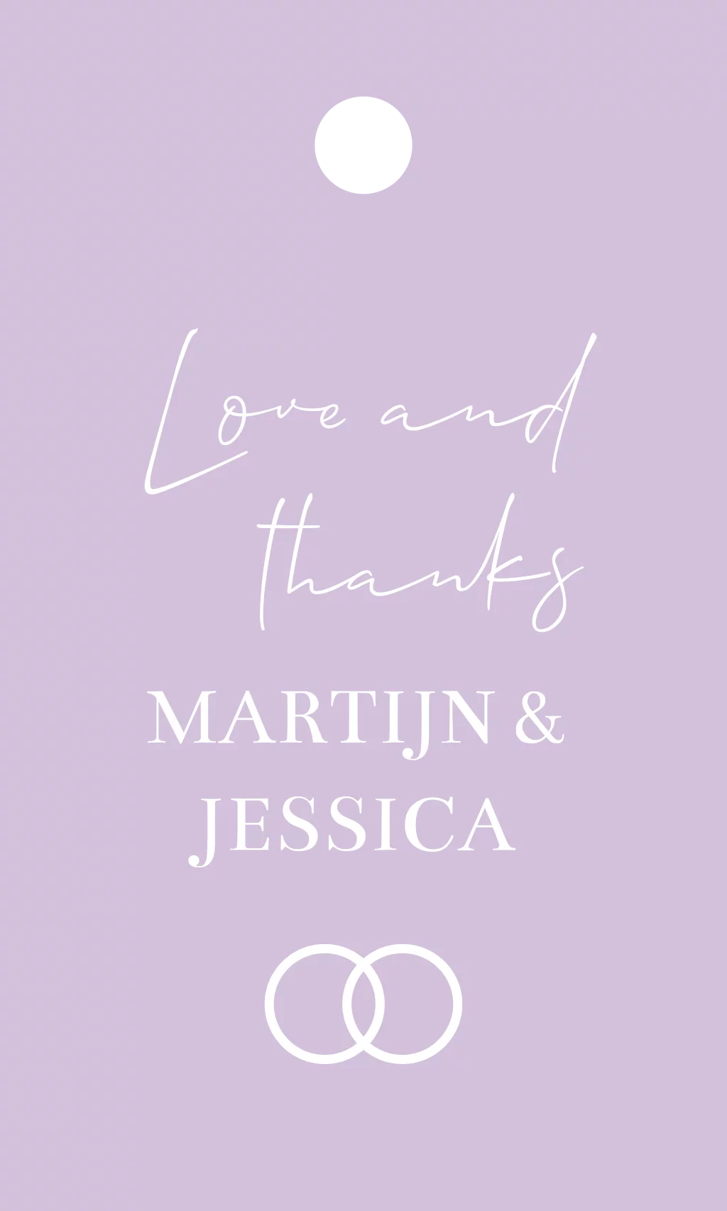 Een labeltje voor aan de bedankjes in de stijl van de trouwkaart in de trendkleur lila! Het label heeft een formaat van 30x50 mm en is voorzien van een klein boorgaatje. Specificaties: - Formaat: 30x50 mm - 18 labels per vel - Papiersoort: coated karton