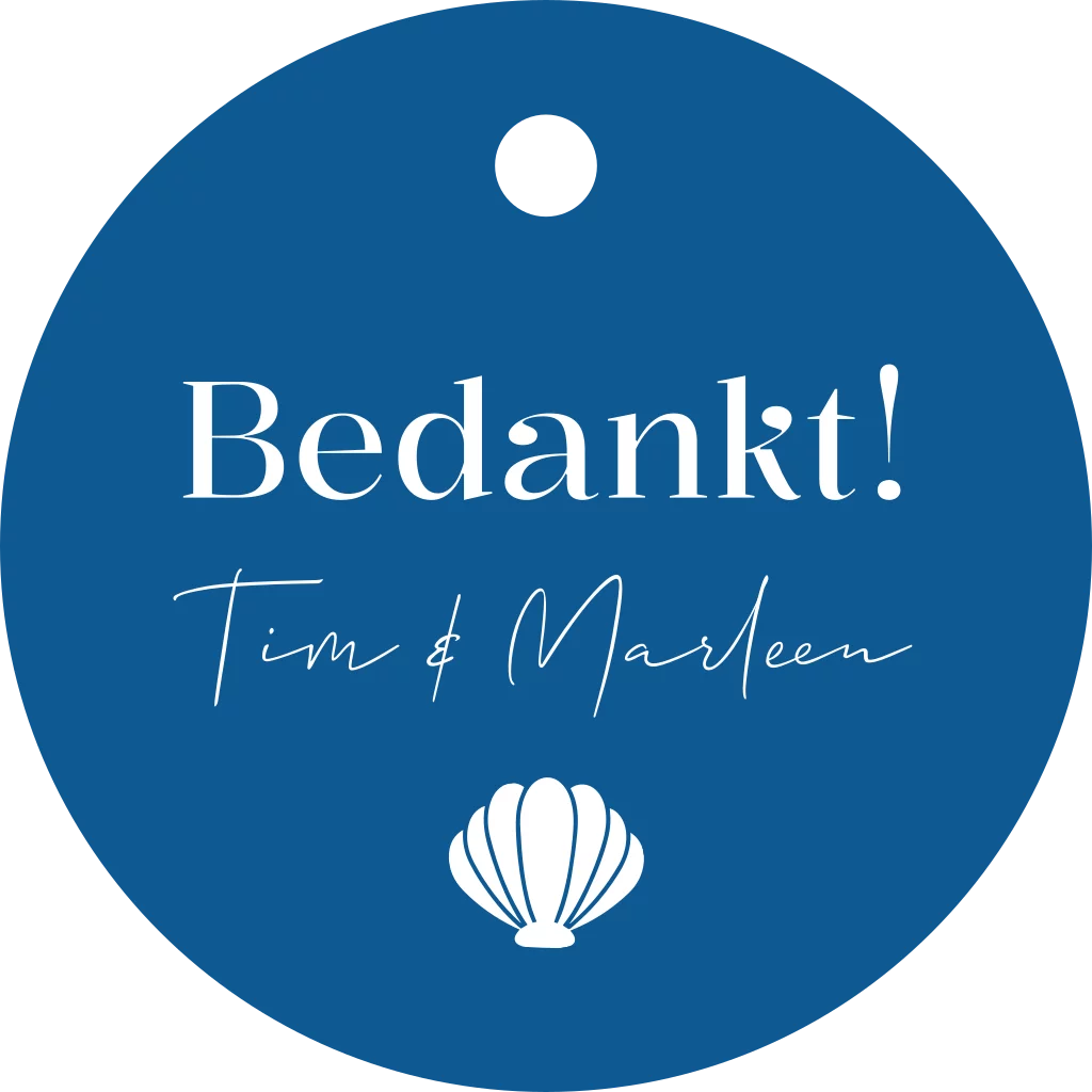 Rond blauw label met witte letters en schelp voor aan de bedankjes op jullie bruiloft. Het ronde label heeft een formaat van 40x40 mm en is voorzien van een klein boorgaatje. Pas het label helemaal aan in de kleuren en stijl van jullie trouwkaart. Specificaties: - Formaat: 40x40 mm - 16 labels per vel - Papiersoort: coated karton