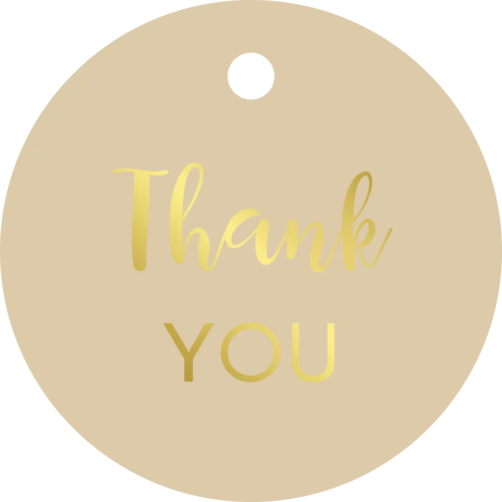 Beige label met goudfolie letters voor aan de bedankjes op jullie bruiloft. Het ronde label heeft een formaat van 40x40 mm en is voorzien van een klein boorgaatje. Pas het label helemaal aan in de kleuren en stijl van jullie trouwkaart.