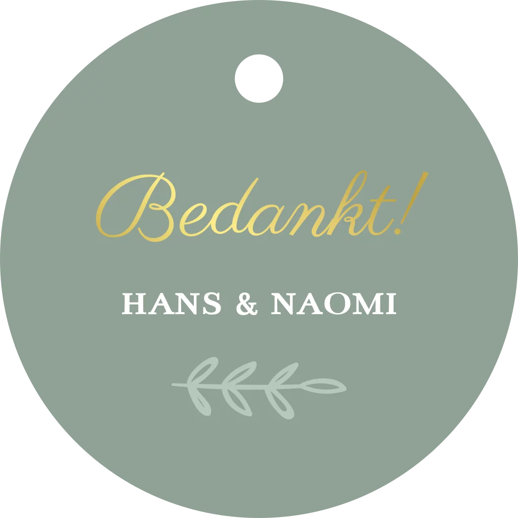 Rond groen label met witte en gouden letters voor aan de bedankjes op jullie bruiloft. Het ronde label heeft een formaat van 40x40 mm en is voorzien van een klein boorgaatje. Pas het label helemaal aan in de kleuren en stijl van jullie trouwkaart. Passend bij de trouwhuisstijl Green Elegance.