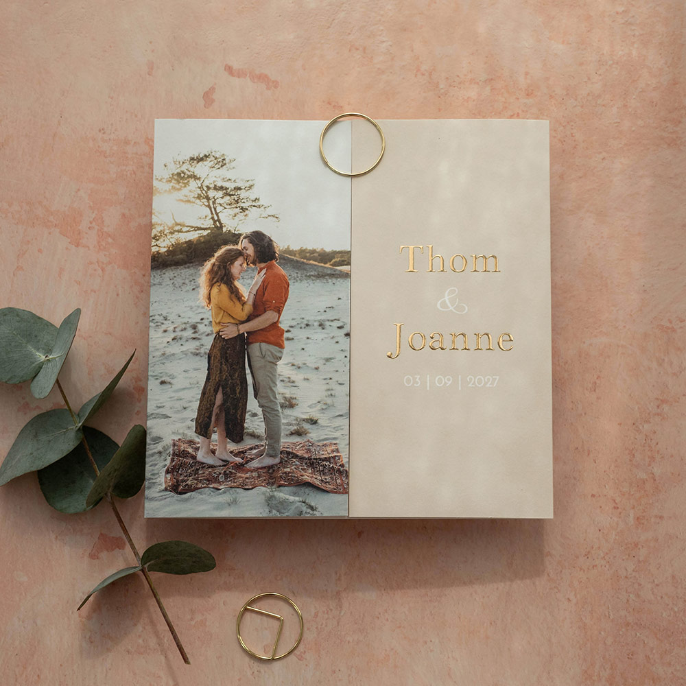 Trouwkaart luikvouw beige foto goudfolie