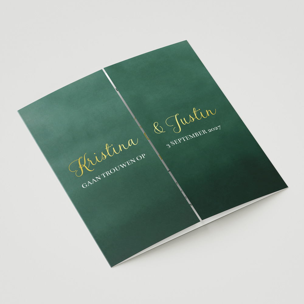 Een klassieke vierkante luikvouw trouwkaart met donkergroene watercolor achtergrond en sierlijke goudfolie letters. Je kunt de kleuren van de trouwkaart nog naar wens aanpassen. Aan de binnenzijde staat een tijdlijn met dagprogramma en icoontjes.