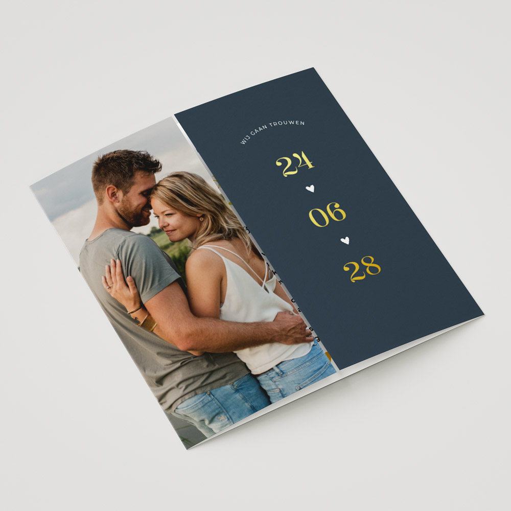 Trouwkaart luikvouw foto donkerblauw goudfolie