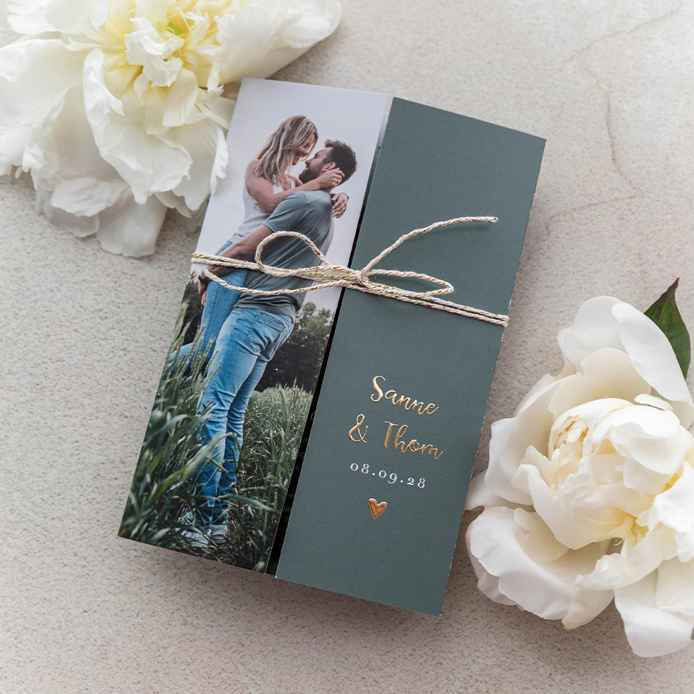 Trouwkaart luikvouw foto goudfolie donkergroen