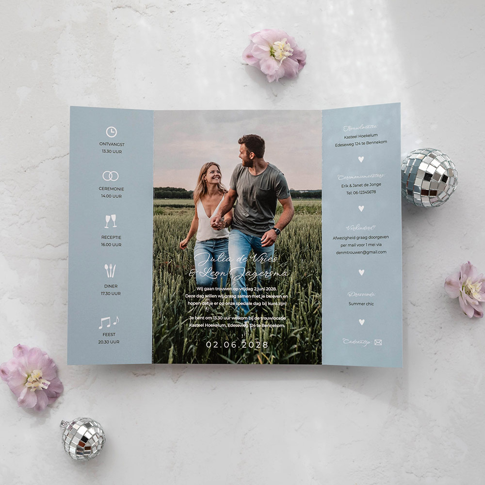 Een unieke staande luikvouw trouwkaart met foto's en lichtblauwe kleur. Je kunt de foto's op de kaart met luikjes makkelijk vervangen door jullie eigen loveshoot foto's. Je kunt de kleuren van de trouwkaart nog naar wens aanpassen. Aan de binnenzijde staat een dagprogramma met icoontjes die je zelf nog kunt invullen. Fotografie: Day of my Life Fotografie