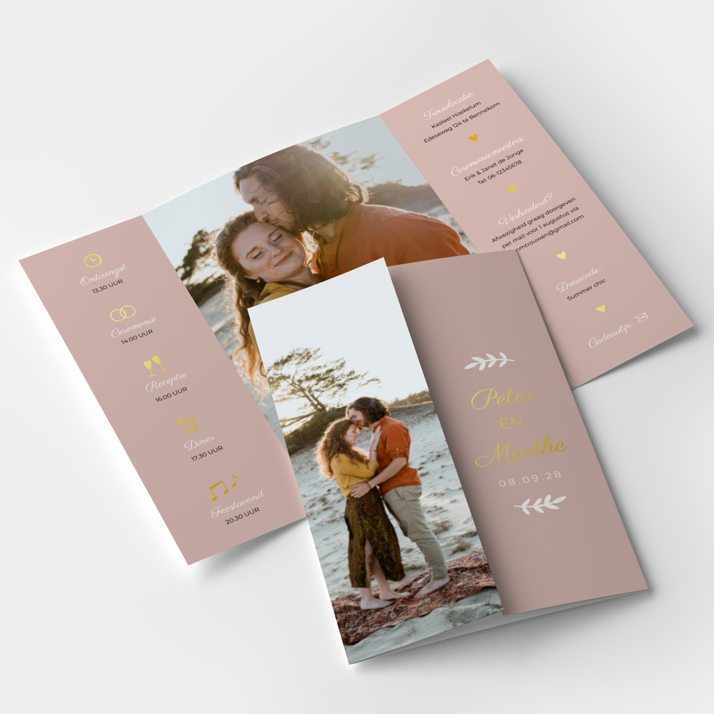 Een originele staande luikvouw trouwkaart met foto's en goudfolie. Je kunt de foto's op de trouwkaart met luikjes makkelijk vervangen door jullie eigen loveshoot foto's. Deze persoonlijke trouwkaart heeft een roze achtergrond kleur met takjes en goudfolie, maar je kunt de kleuren van de kaart nog naar wens aanpassen. Aan de binnenzijde staat een dagprogramma voor jullie bruiloft met icoontjes die je nog zelf kunt invullen. Fotografie: Day of my Life Fotografie