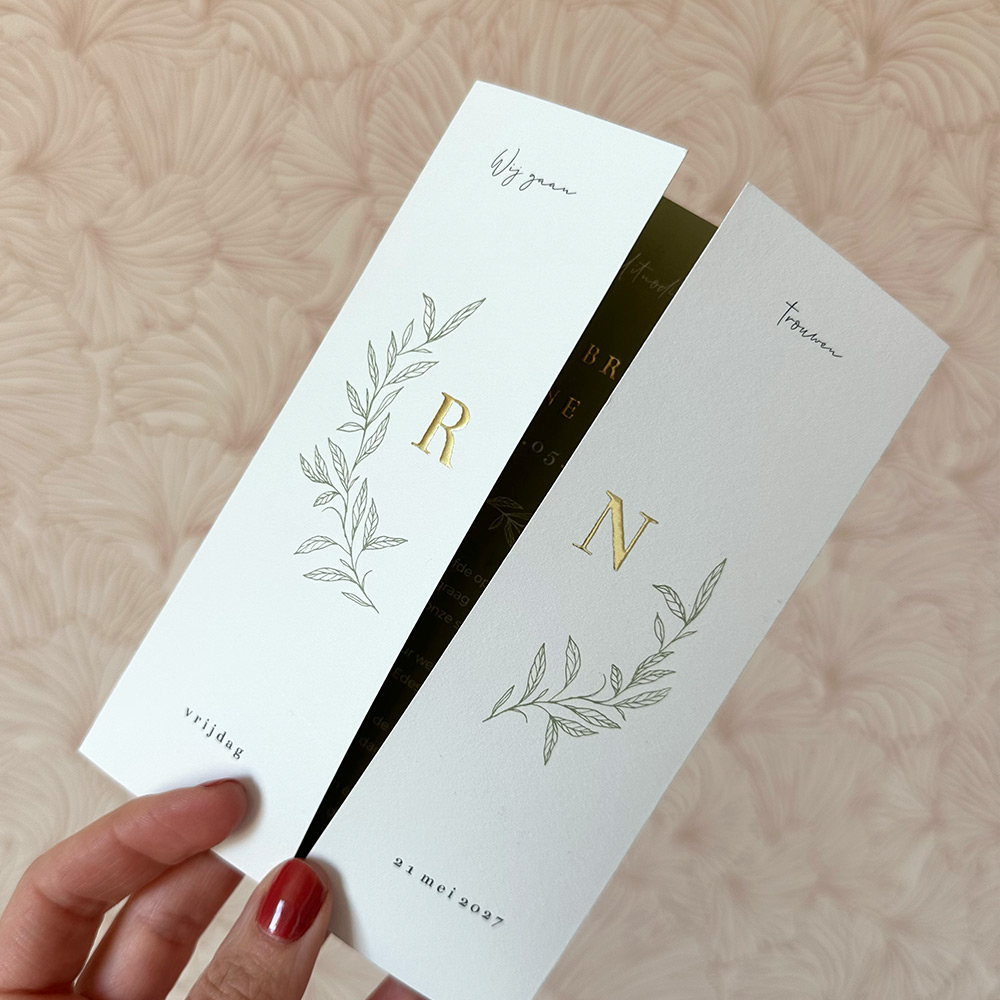 Een klassieke staande luikvouw trouwkaart met groene krans van takjes en goudfolie. Je kunt de kleuren van de trouwkaart met luikjes nog naar wens aanpassen. Aan de binnenzijde staat een dagprogramma en icoontjes die je zelf nog kunt invullen. Het touw bestel je los bij de kaarten.