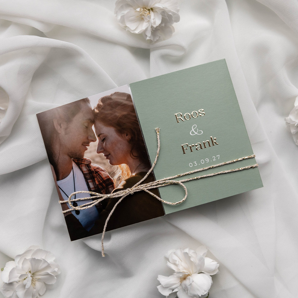 Trouwkaart luikvouw liggend foto groen goudfolie