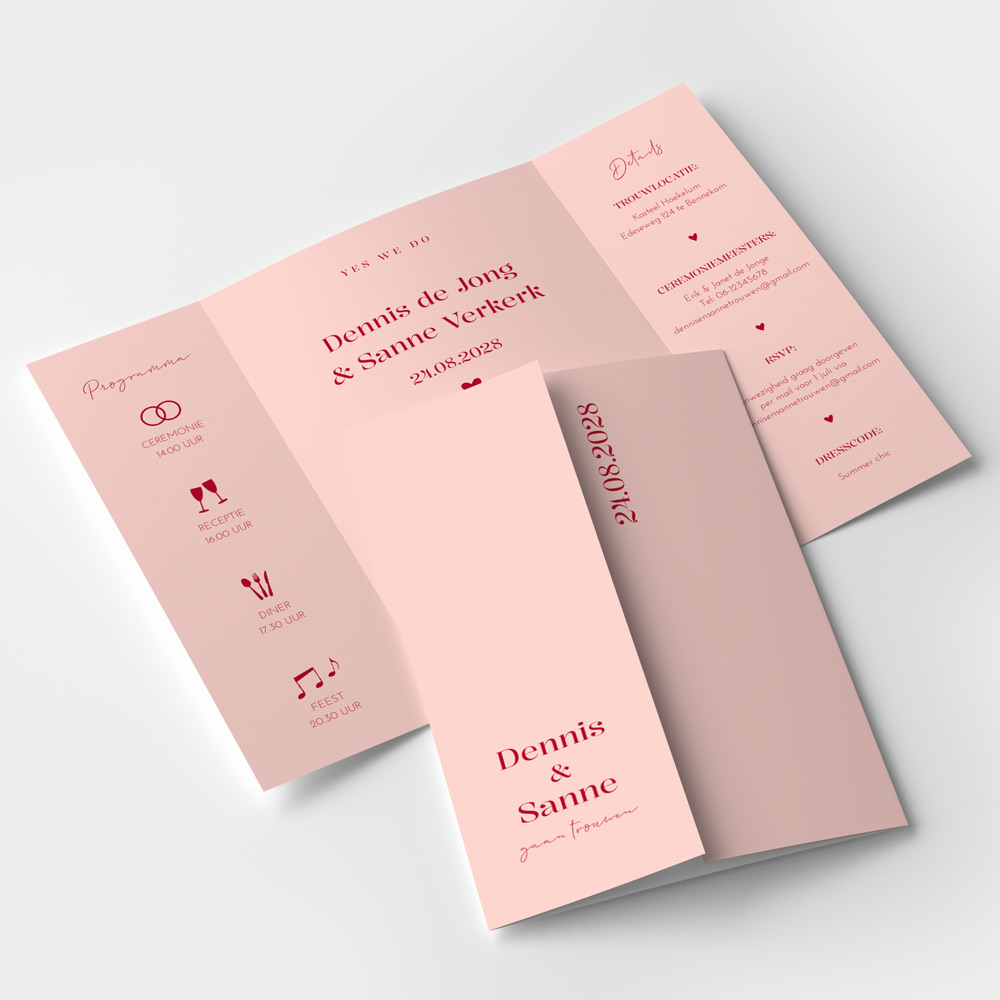 Een moderne staande luikvouw trouwkaart met roze achtergrond en rode letters. Je kunt de kleuren van de trouwkaart nog naar wens aanpassen. Aan de binnenzijde staat een dagprogramma met icoontjes. Thema: Pink Love