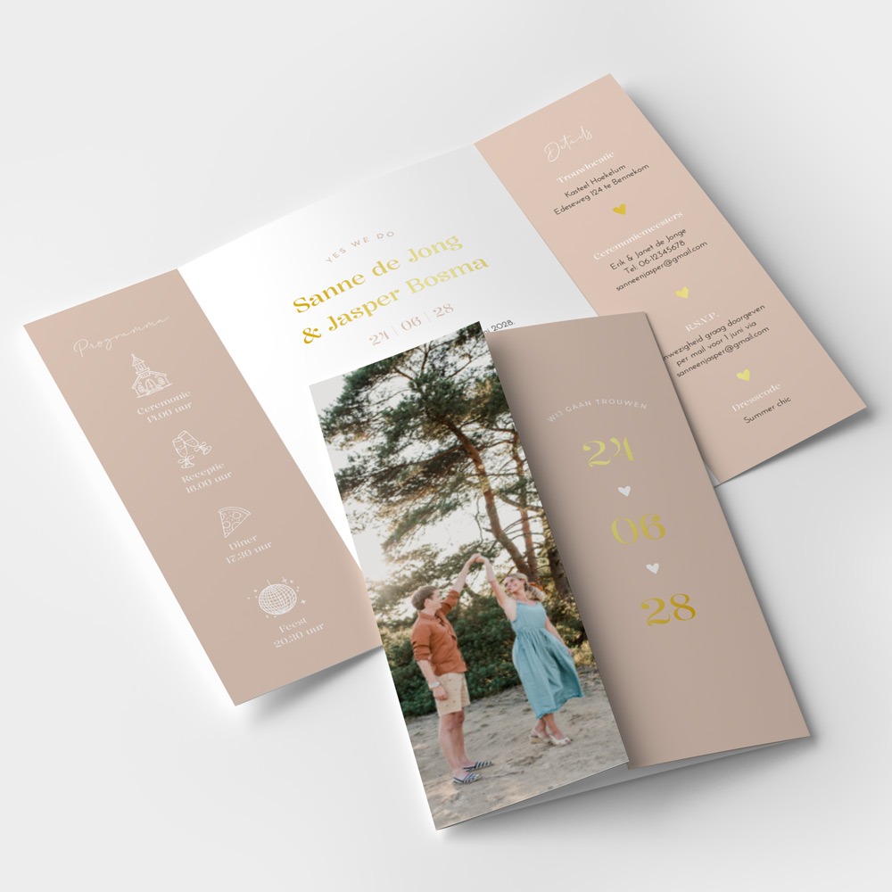 Een originele staande luikvouw trouwkaart met foto en goudfolie. Je kunt de foto's op de trouwkaart met luikjes makkelijk vervangen door jullie eigen loveshoot foto's. Deze persoonlijke trouwkaart heeft een peach achtergrond kleur met elementen in goudfolie, maar je kunt de kleuren van de kaart nog naar wens aanpassen. Aan de binnenzijde staat een dagprogramma voor jullie bruiloft met icoontjes die je nog zelf kunt invullen. Fotografie: Day of my Life Fotografie