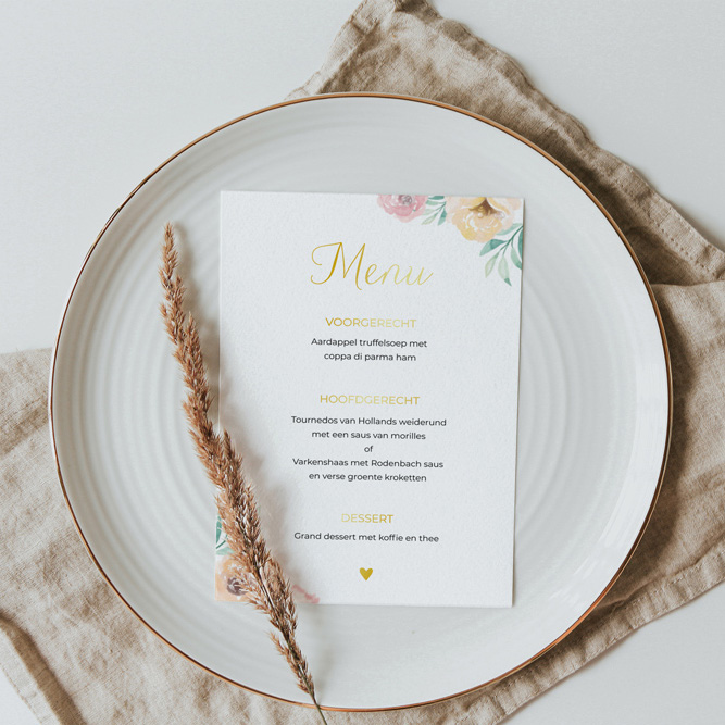 Menukaart bloemen watercolor goudfolie menu trouwhuisstijl