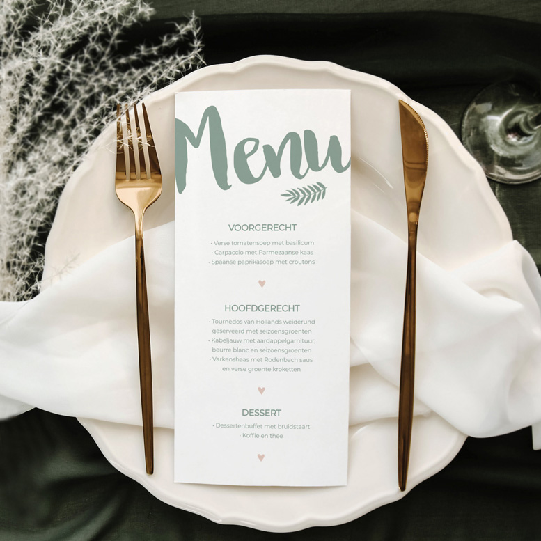 Menukaart botanisch groen met roze hartjes