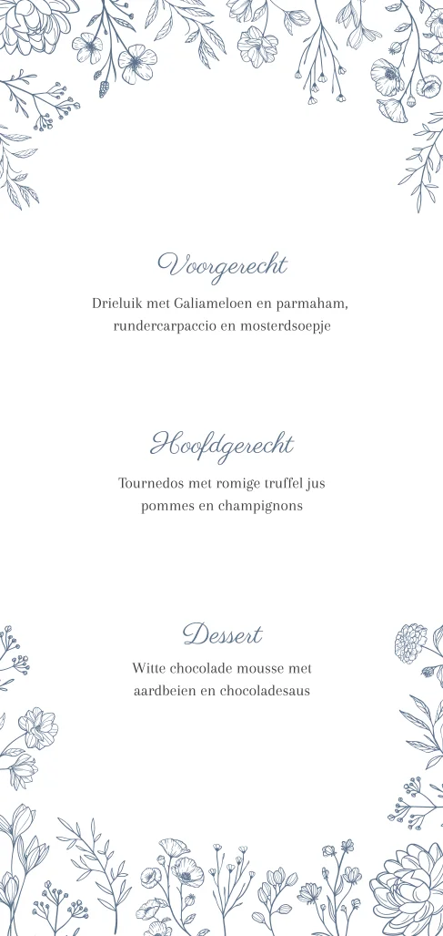 Klassieke menukaart met blauwe bloemen en goudfolie. Kies voor een complete trouwhuisstijl, zodat de menukaart en naamkaartjes perfect bij jullie trouwkaart passen!| Totaalprijs: 0 |