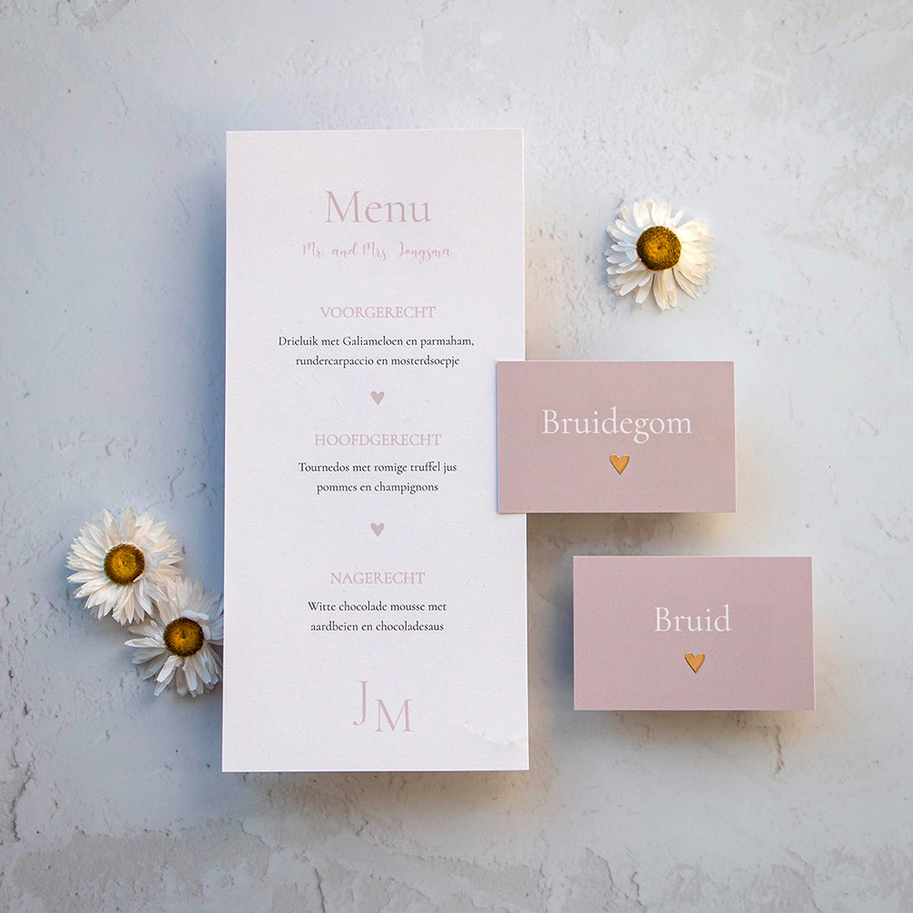 Klassieke menukaart met witte achtergrond en lichtroze letters. Onderaan een trouwlogo met de initialen van jullie naam. Pas de kleuren van de menukaart helemaal aan naar wens in de stijl van jullie eigen trouwkaart, zodat alles perfect bij elkaar past!