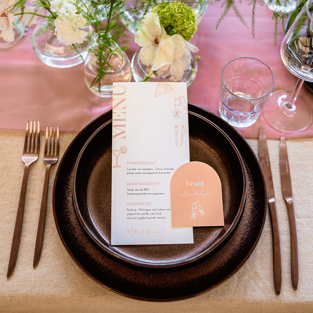 Moderne menukaart met getekende icoontjes in roze en oranje kleuren. Deze menukaart is onderdeel van een complete trouwhuisstijl, zodat alles voor jullie bruiloft perfect bij elkaar past! Fotografie: Lisan Spiegelaar| Totaalprijs: 0 |