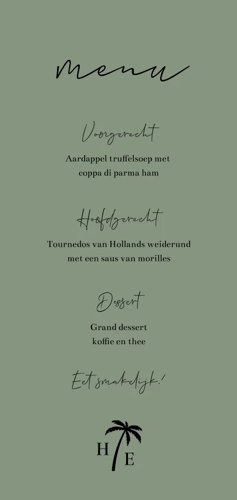Moderne menukaart met olijfgroene achtergrond en zwarte letters. Onderaan een trouwlogo met de initialen van jullie naam en een palmboom. Pas de kleuren van de menukaart helemaal aan naar wens in de stijl van jullie eigen trouwkaart, zodat alles perfect bij elkaar past!