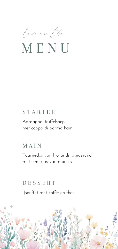 Romantische menukaart met een rand van pastel gekleurde bloemen. Aan de bovenzijde kun je een klein naamkaartje in de vorm van een label vastmaken met een paperclip. Deze menukaart is onderdeel van een complete trouwhuisstijl, zodat alles voor jullie bruiloft perfect bij elkaar past!Totaalprijs: 0 |