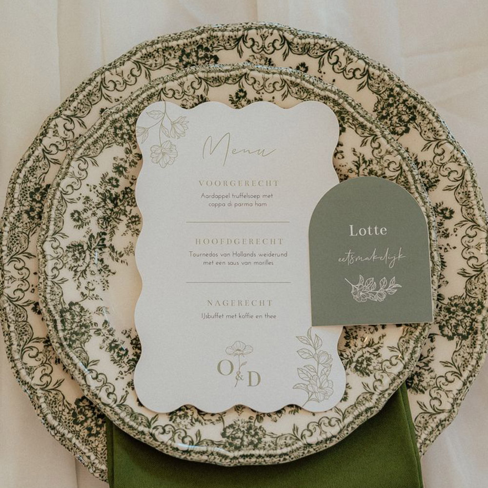 Golvende menukaart met witte achtergrond en getekende groene bloemen. Pas de kleuren van de menukaart helemaal aan naar wens in de stijl van jullie eigen trouwkaart, zodat alles perfect bij elkaar past! Fotografie: Jessica v/d Berg Fotografie