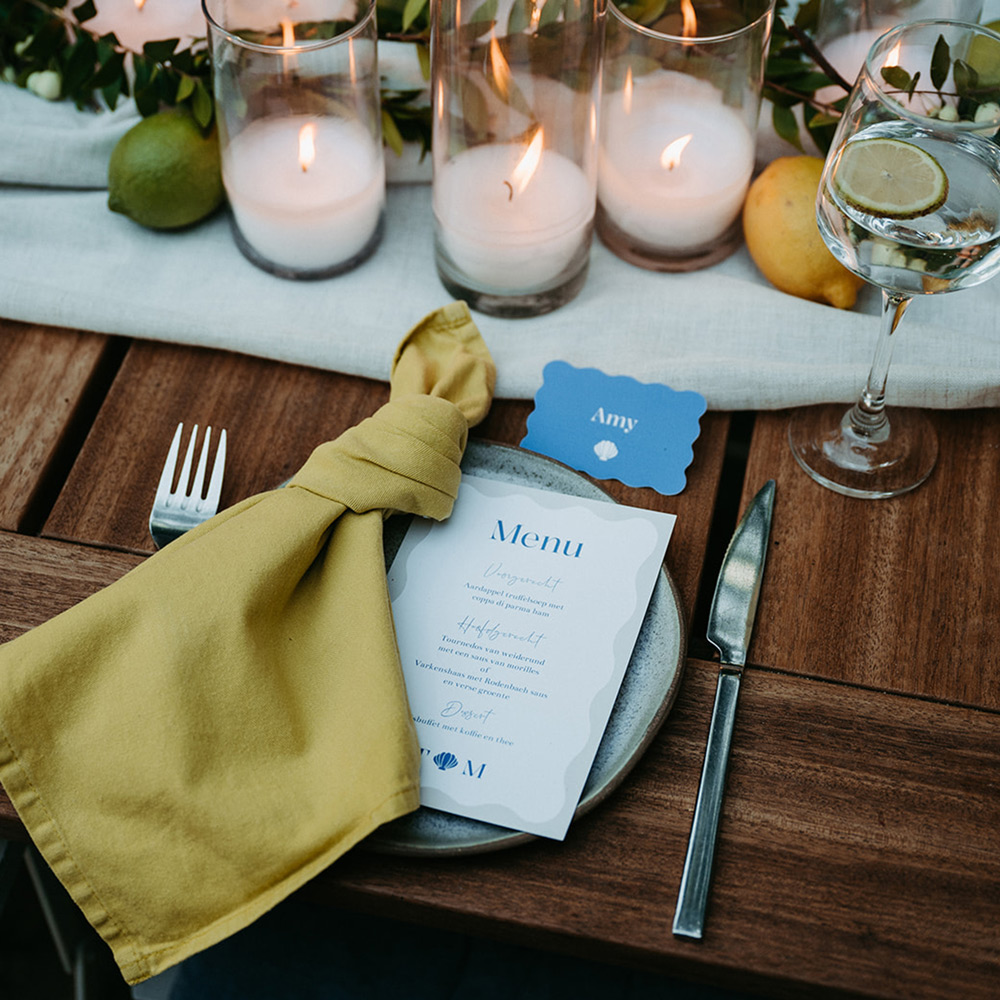 Staande menukaart met golf vorm en schelp, in beige, witte en blauwe kleuren. Perfect voor bij een strand bruiloft of een bruiloft in het buitenland. Pas de kleuren van de menukaart helemaal aan naar wens in de stijl van jullie eigen trouwkaart, zodat alles mooi bij elkaar past!| Totaalprijs: 0 |