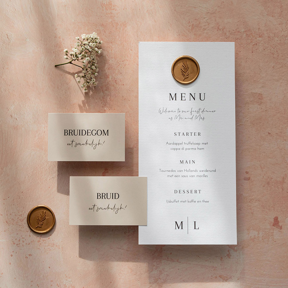 Langwerpige en klassieke menukaart met een luxe lakzegel. De menukaart heeft een witte achtergrond met zwarte letters. Tip: druk de menukaart af op een luxe papiersoort zoals Oud Hollands. Let op: de lakzegels mag je er nog los bij bestellen en deze kun je vinden bij de Extra producten.| Totaalprijs: 0 |