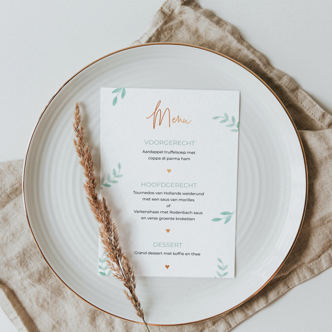 Staande menukaart met botanische takjes en rosefolie elementen. Pas de kleuren van de menukaart helemaal aan naar wens in de stijl van jullie eigen trouwkaart, zodat alles perfect bij elkaar past!