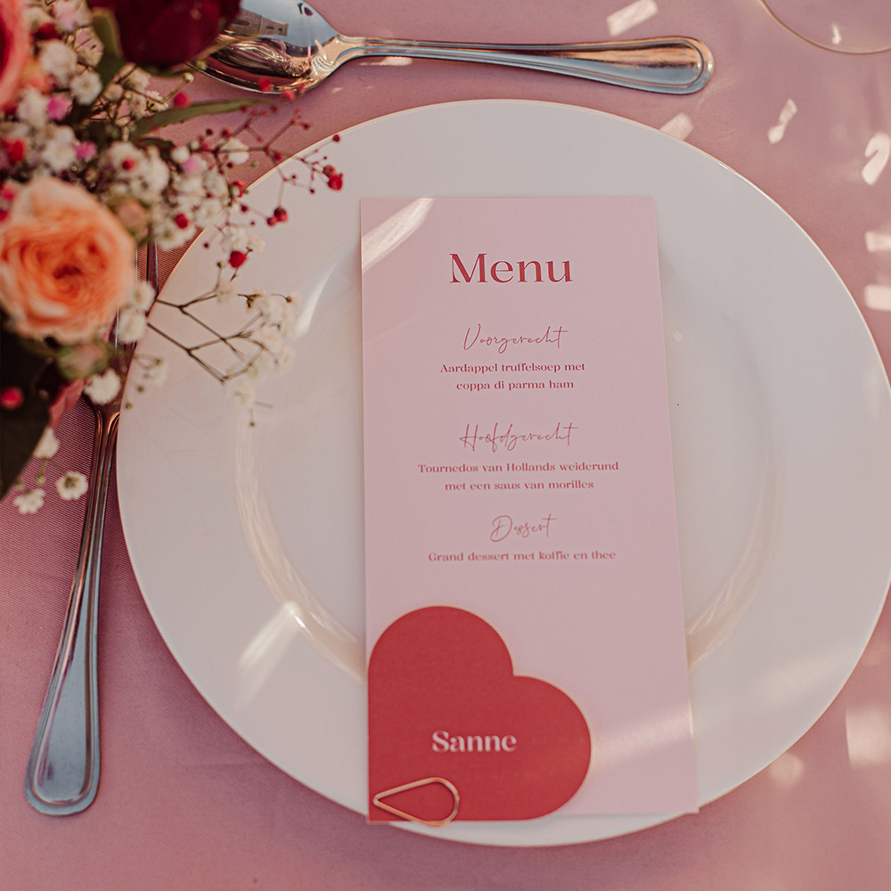 Langwerpige menukaart met roze en rode kleuren. Onderaan kun je de bijpassende naamkaartjes bevestigen met een paperclip. Pas de kleuren van de menukaart helemaal aan naar wens in de stijl van jullie eigen trouwkaart, zodat alles perfect bij elkaar past! Fotografie: Isa van den Belt Fotografie