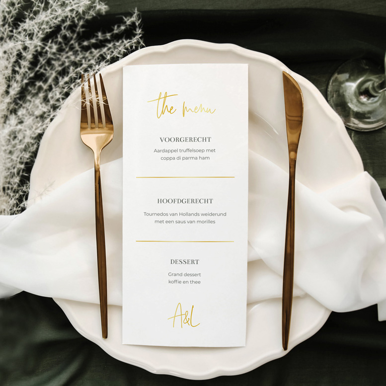 Langwerpige menukaart met witte achtergrond, goudfolie en sierlijke letters. Onderaan een trouwlogo met de initialen van jullie naam. Pas de kleuren van de menukaart helemaal aan naar wens in de stijl van jullie eigen trouwkaart, zodat alles perfect bij elkaar past!