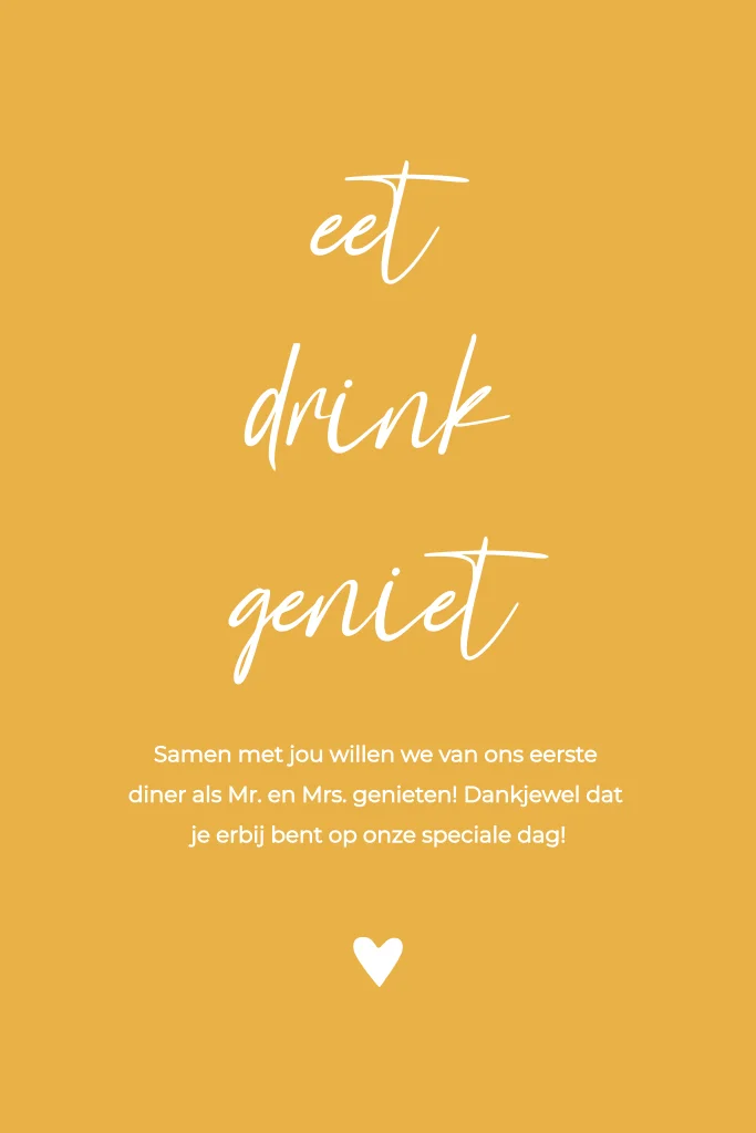 Tafelkaartje bruiloft diner okergeel modern hartje