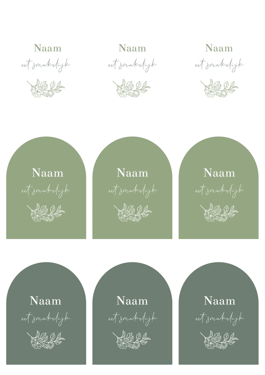 Unieke naamkaartjes in boogvorm voor bij het diner van jullie bruiloft in groene kleuren met bloemen illustratie. De naamkaartjes hebben een boogvorm formaat van 6,5x8 cm en zijn enkelzijdig bedrukt. Er zitten 9 stuks op 1 vel die je tegelijk kunt bewerken in de editor.